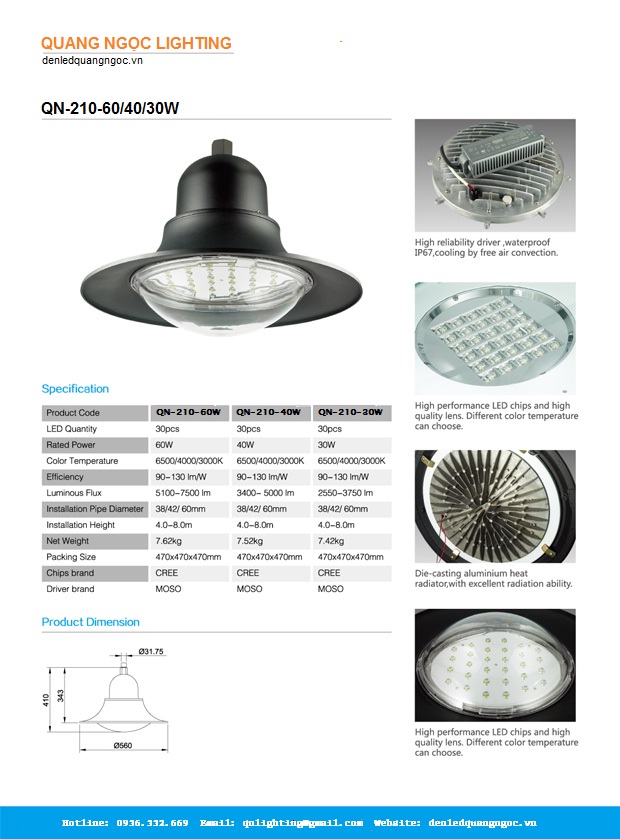 Đèn cột sân QN-210-60/40/30W được sử dụng chiếu sáng đường phố, công viên, vườn hoa, ....Đèn được treo cố định hoặc treo vào đầu cần của cột đèn. Kính đèn được làm bằng nhựa PC trong suốt có kháng UV. Chòa đèn phản quang làm bằng nhôm tinh khiết, được anot hóa, phân bố ánh sáng rộng; Cuống đèn làm bằng nhôm đúc chịu áp lực cao.