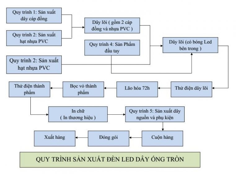 – Sản xuất từ A-Z theo quy trình tự động tiêu chuẩn Châu Âu: Sản xuất hạt nhựa PVC, sản xuất dây đồng, sản xuất bóng Led, sản xuất phụ kiện, sản xuất chuỗi dây bóng Led.